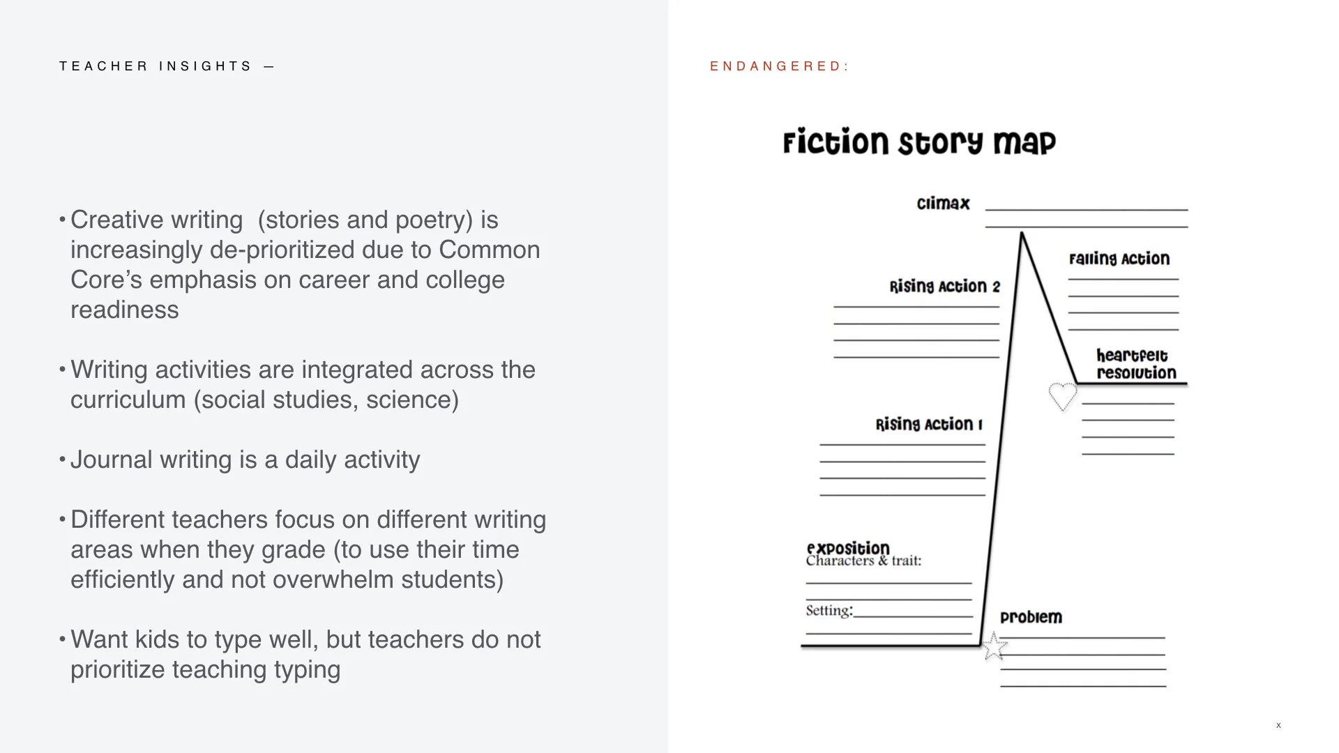 Writing instruction is often piecemeal, integrated across other subjects, and could use more focused monitoring and attention. Creative fiction writing is endangered in American elementary and middle school classrooms due to the demands of the Common Core course load.